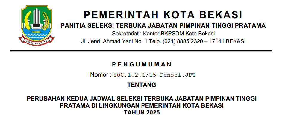 Bekasi, 27 Oktober 2025 – Panitia Seleksi Terbuka Jabatan Pimpinan Tinggi Pratama Pemerintah Kota Bekasi kembali mengumumkan perubahan kedua jadwal pelaksanaan seleksi terbuka JPT Pratama Tahun 2025.